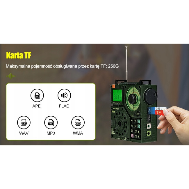 Підтримка TF карт (до 256G); Радіо TR112 може відтворювати вашу улюблену музику у форматі MP3/WMA/WAV/APE/FLAC; Картка TF не входить.