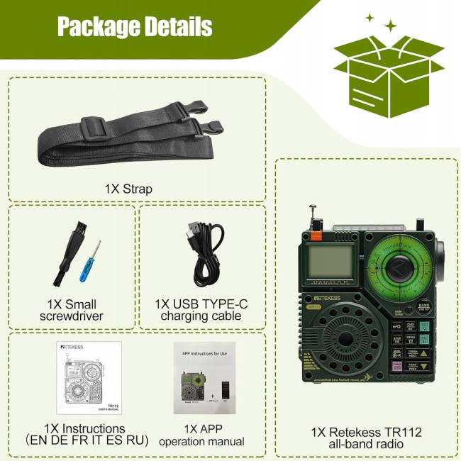 - Дуже чутливий прийом; дозволяє легше знаходити музику та інформацію за допомогою багатодіапазонного радіо TR112