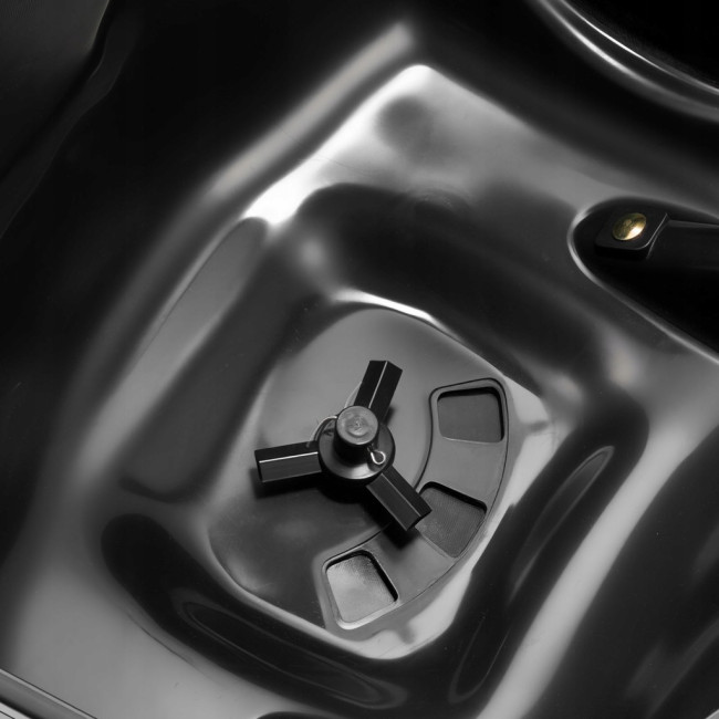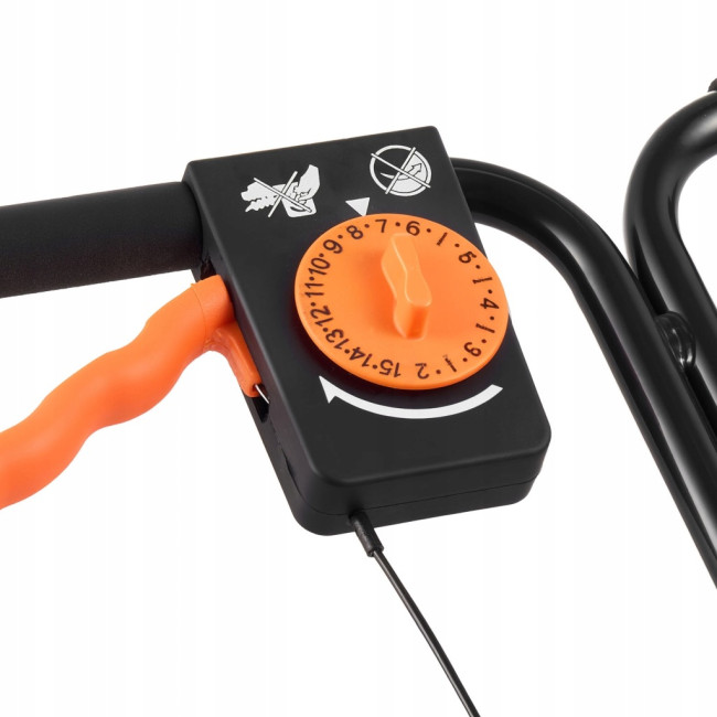 Модель оснащена системою точного регулювання з 30 рівнями подачі, що дозволяє налаштувати інтенсивність розкидання залежно від типу матеріалу та площі обробки. Це допомагає уникнути перевитрати та забезпечує рівномірне покриття.