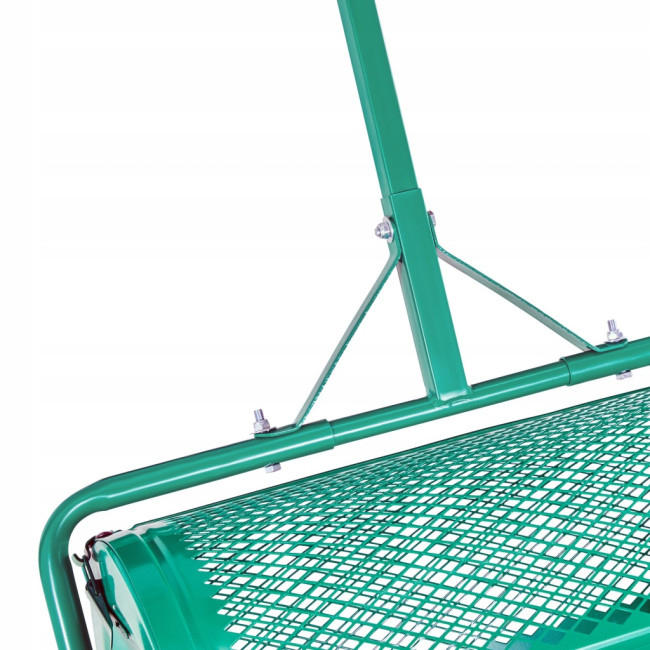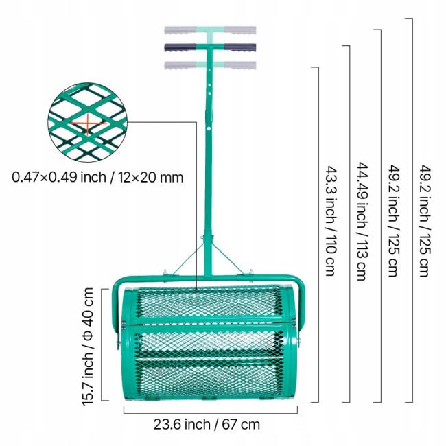 Під час руху барабан обертається та поступово висипає матеріал через металеву сітку, рівномірно розподіляючи його по поверхні. Розмір комірок дозволяє розсівати матеріал без грудок і перевитрати. Ви можете контролювати щільність розкидання швидкістю руху.