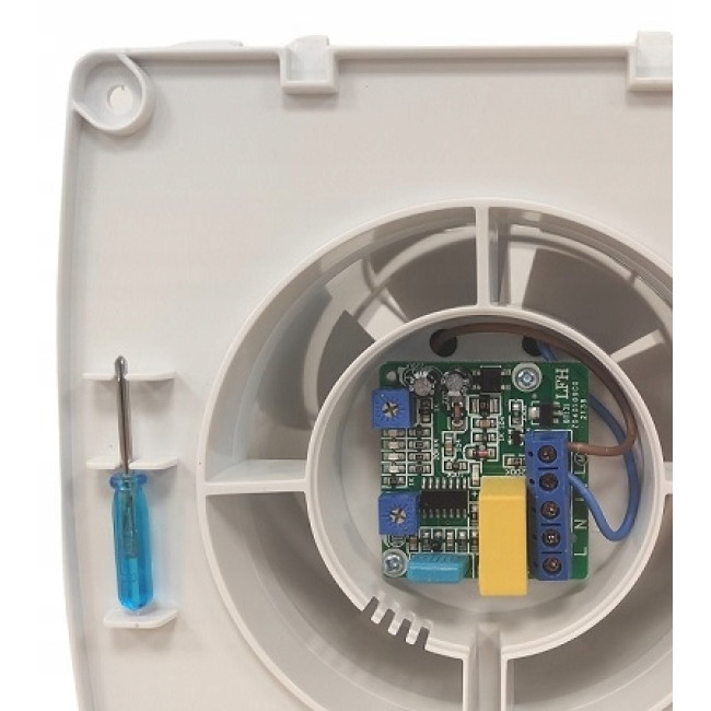 Вентилятор включає в себе викрутку, приховану в корпусі, для регулювання параметрів гігростата, що дозволяє швидко і без проблем змінювати налаштування.